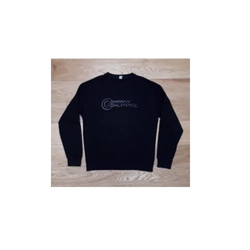 A black crew-neck sweatshirt in a unisex style, featuring our logo in its original colours.
